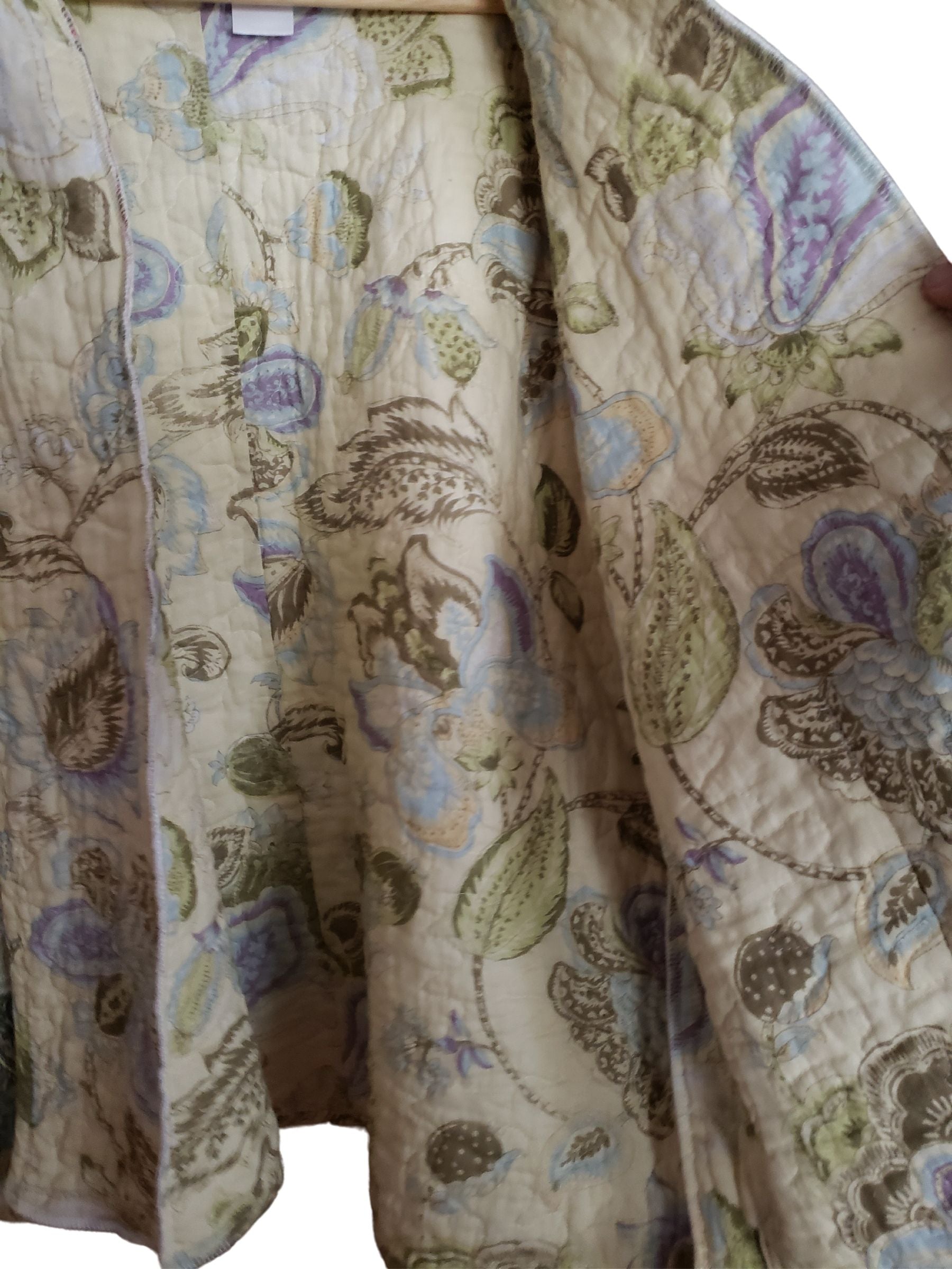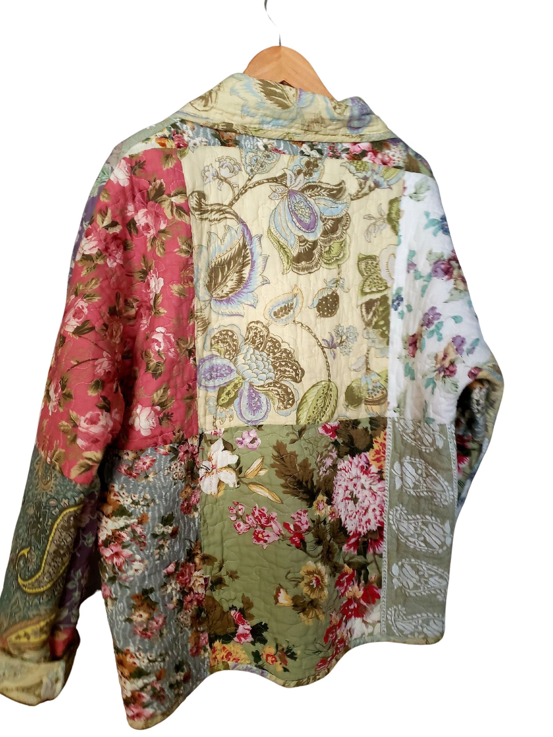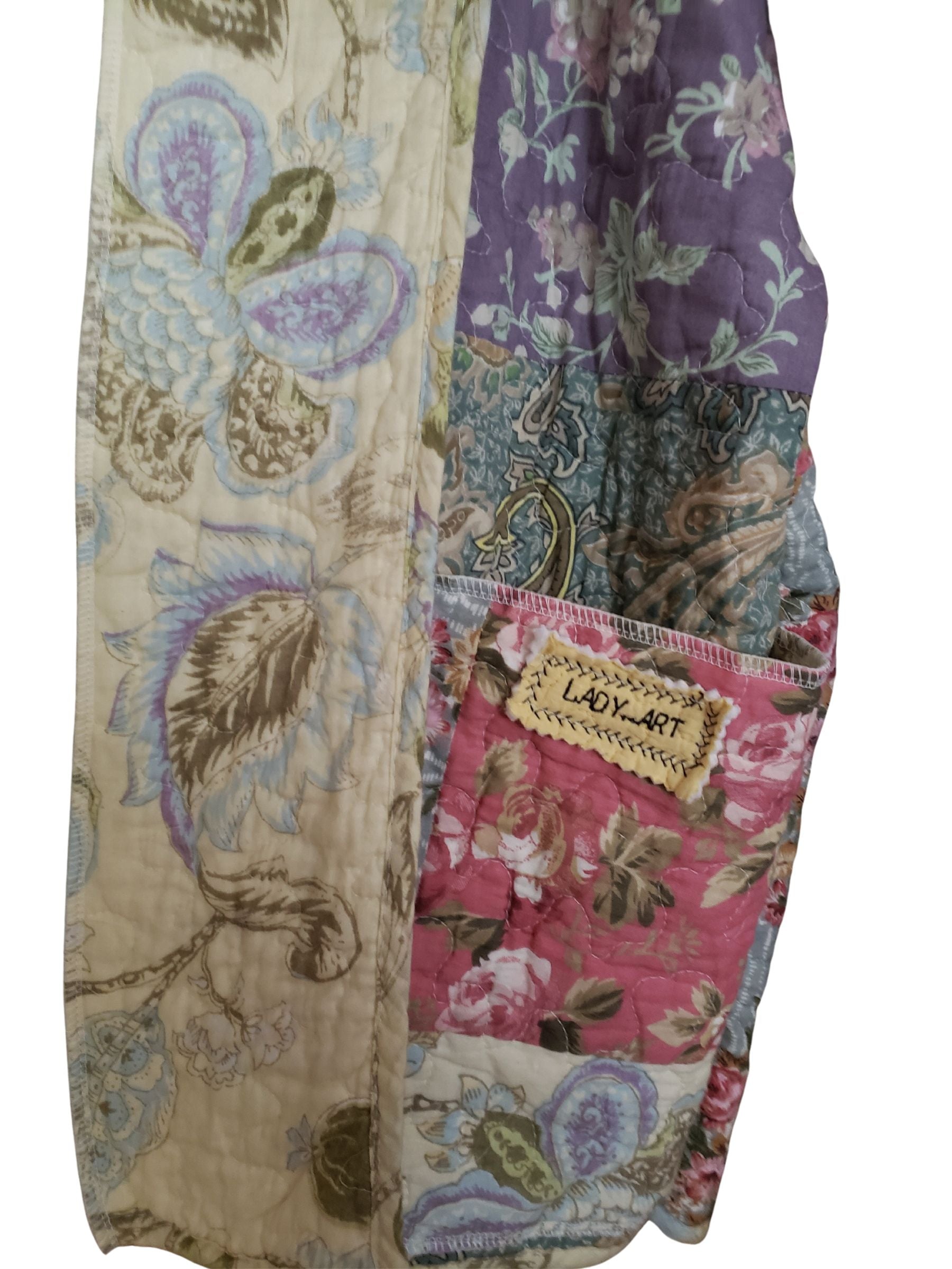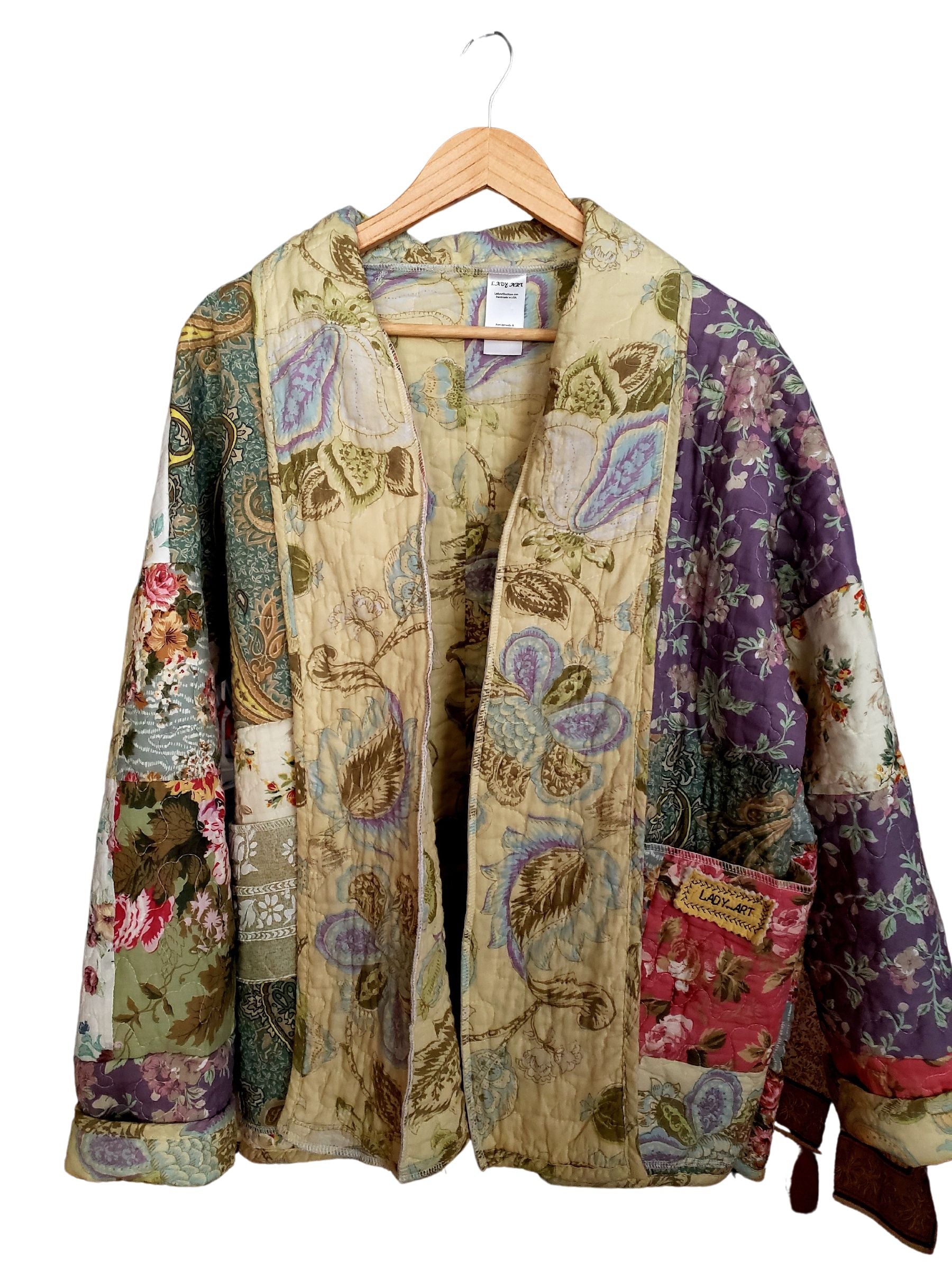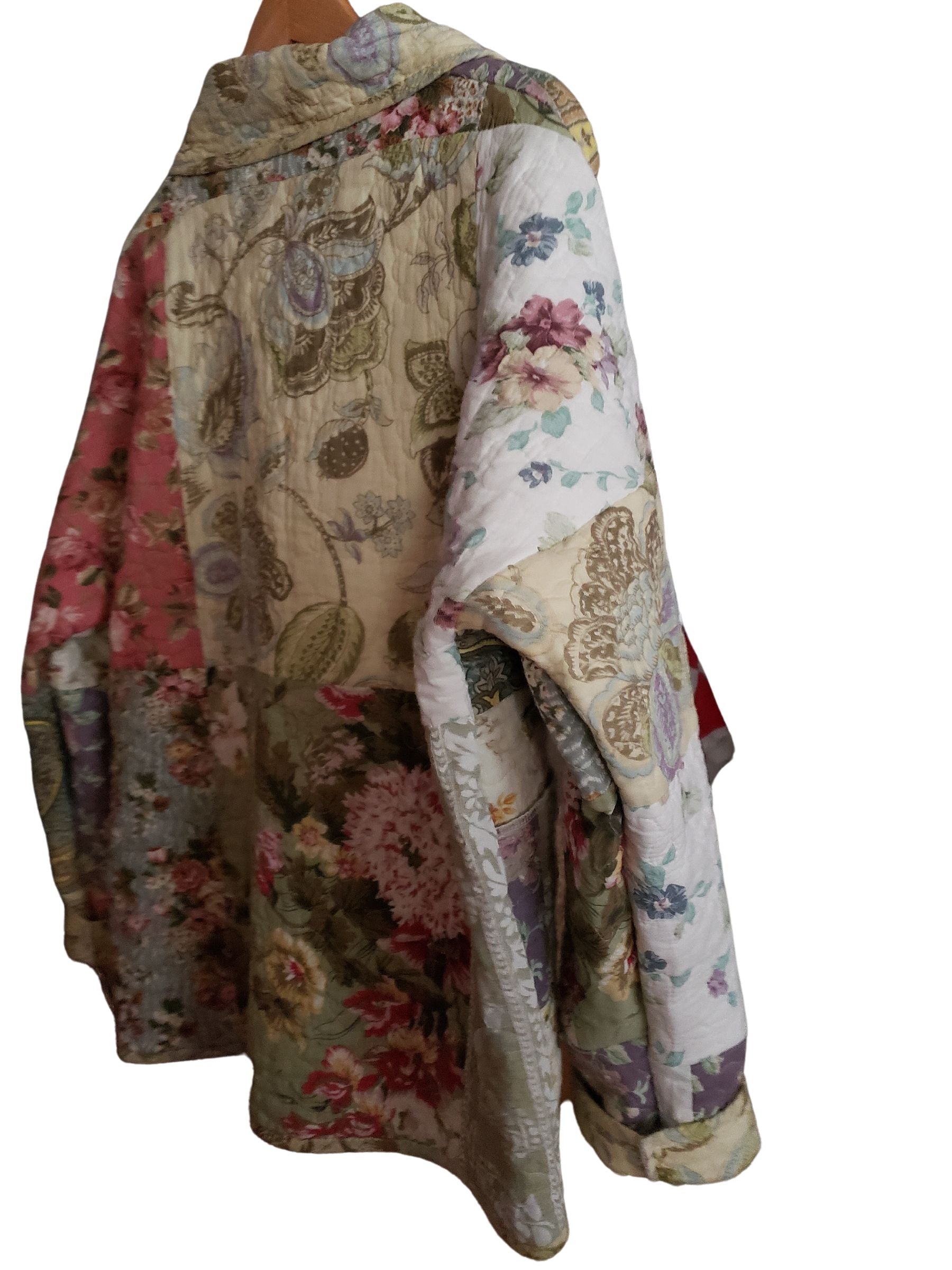 Beautiful, one of a kind, quilt coat made from patchwork patch quilt that I rescued on one of my adventures. Two large deep front pockets double stitched to reinforce the seams. This is a collage of beautiful floral & toile patch prints in creams, pinks, sage green and purples and yellow. Top is a cotton patches and the inside lining is 100% cotton. All seams are 4 thread surged finished